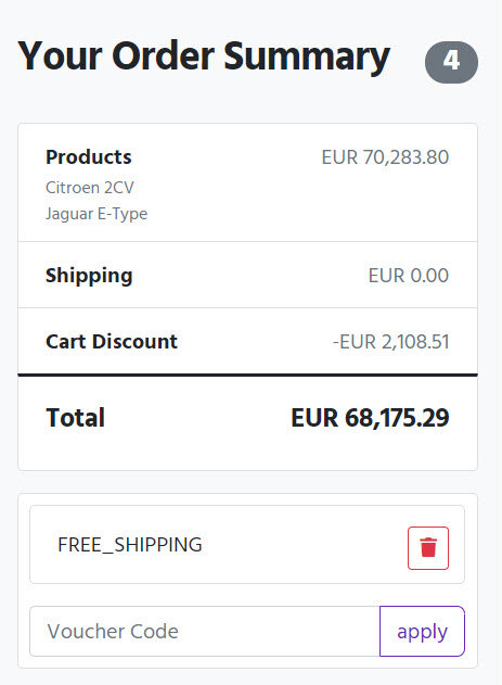 Add voucher code 'FREE_SHIPPING' and get free shipping when you have a sports car in your cart.